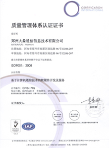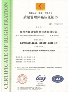 大象通信严格的按照ISO9001质量体系进行标准化管理,并已通过了国家质量认证机构的审核,获得了ISO9001(2000版)认证,持有中国质量认证中心颁发的CQC证书。